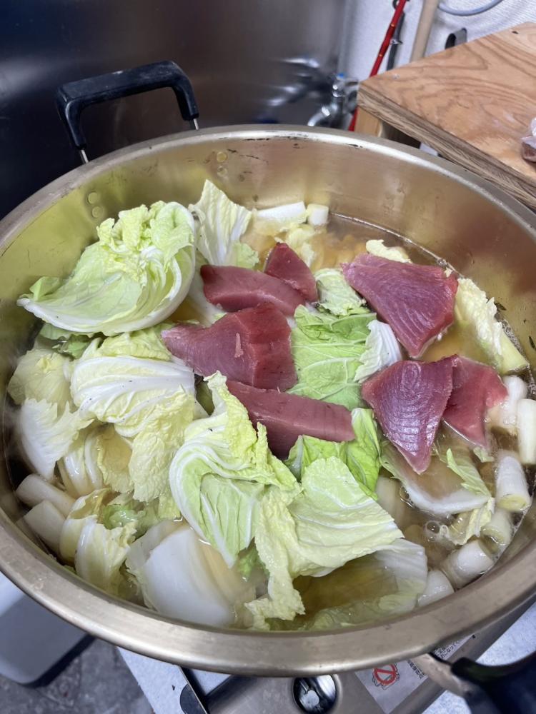 みんなでマグロ鍋とアマダイの松笠揚げで祝杯しました